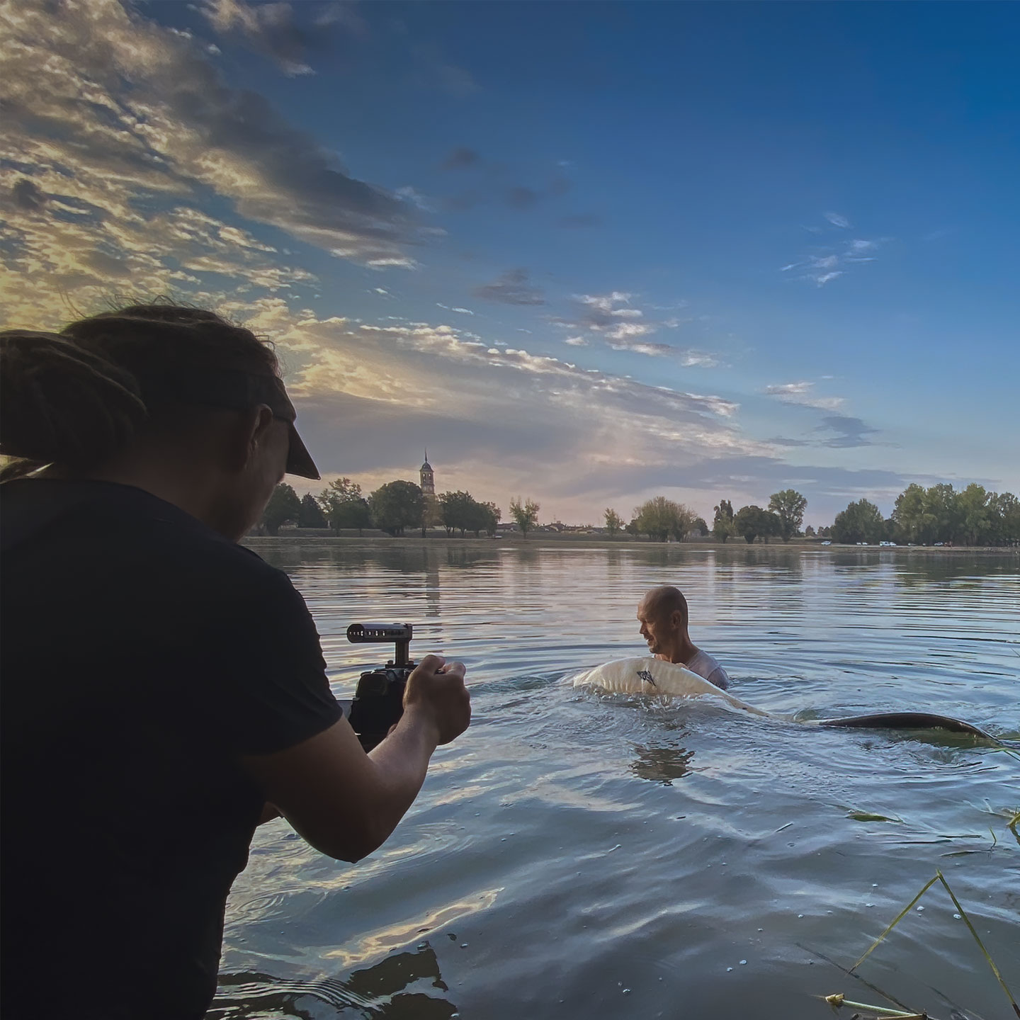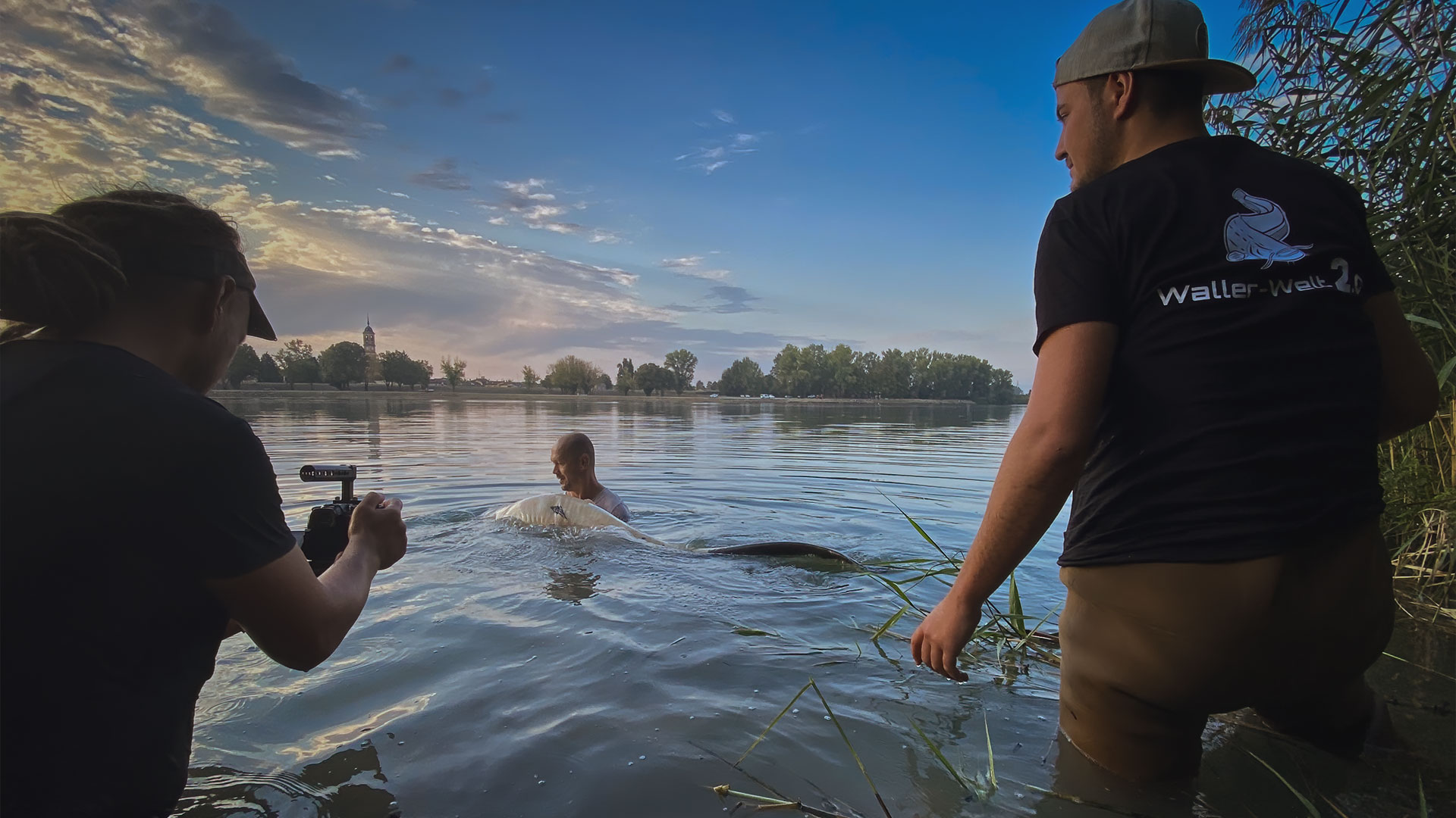 Klopf – Klopf – Klopf … Uuund Biss!!! Zunächst war alles ganz normal, doch dann sahen wir einen weiß-schwarzen Fischkörper aufsteigen! Das gibt’s doch nicht… Ein paar Stunden zuvor, als wir unser Tackle zum Angeln bereit machten, sagte Marcel noch: „Jungs, heute fangen wir einen Mandarin-Wels ok!?“ Gesagt – getan… Ihr könnt euch gar nicht vorstellen, wie blöd wir aus der Wäsche kuckten, als plötzlich wirklich einer dieser ganz besonderen Ausnahmefische an der Wasseroberfläche erschien. Es war ein super Teamwork zwischen meinem Gast Marcel, dem hiesigen Angler Paulo und meiner Wenigkeit, so konnten wir diese Schönheit zum Biss überlisten… Darf ich vorstellen – Annabelle – Der neueste Zuwachs in der Waller-Welt 2.0!